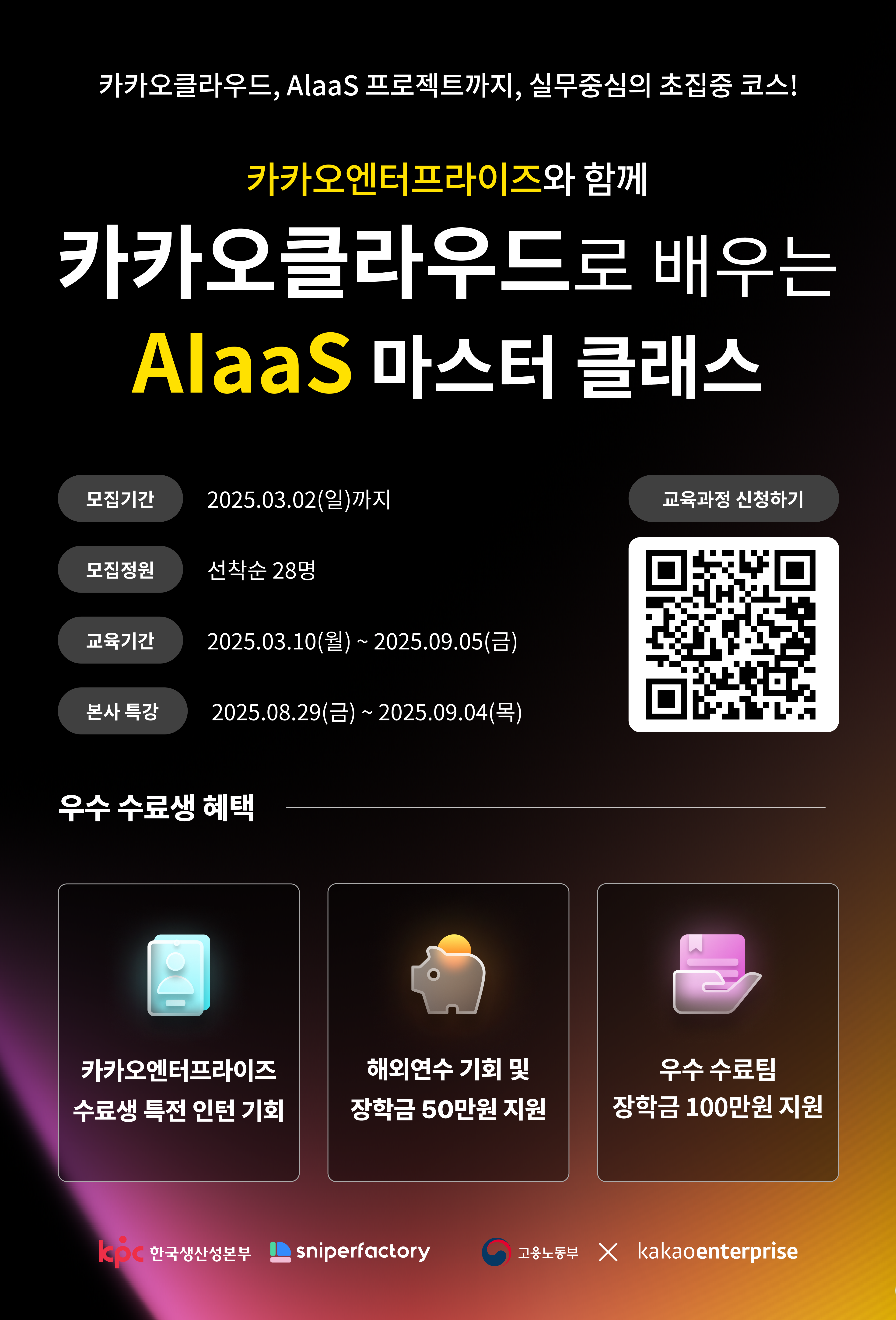 - [고용노동부X카카오엔터프라이즈X스팩스페이스] 카카오클라우드 AIaaS 마스터 클래스(~3/2)