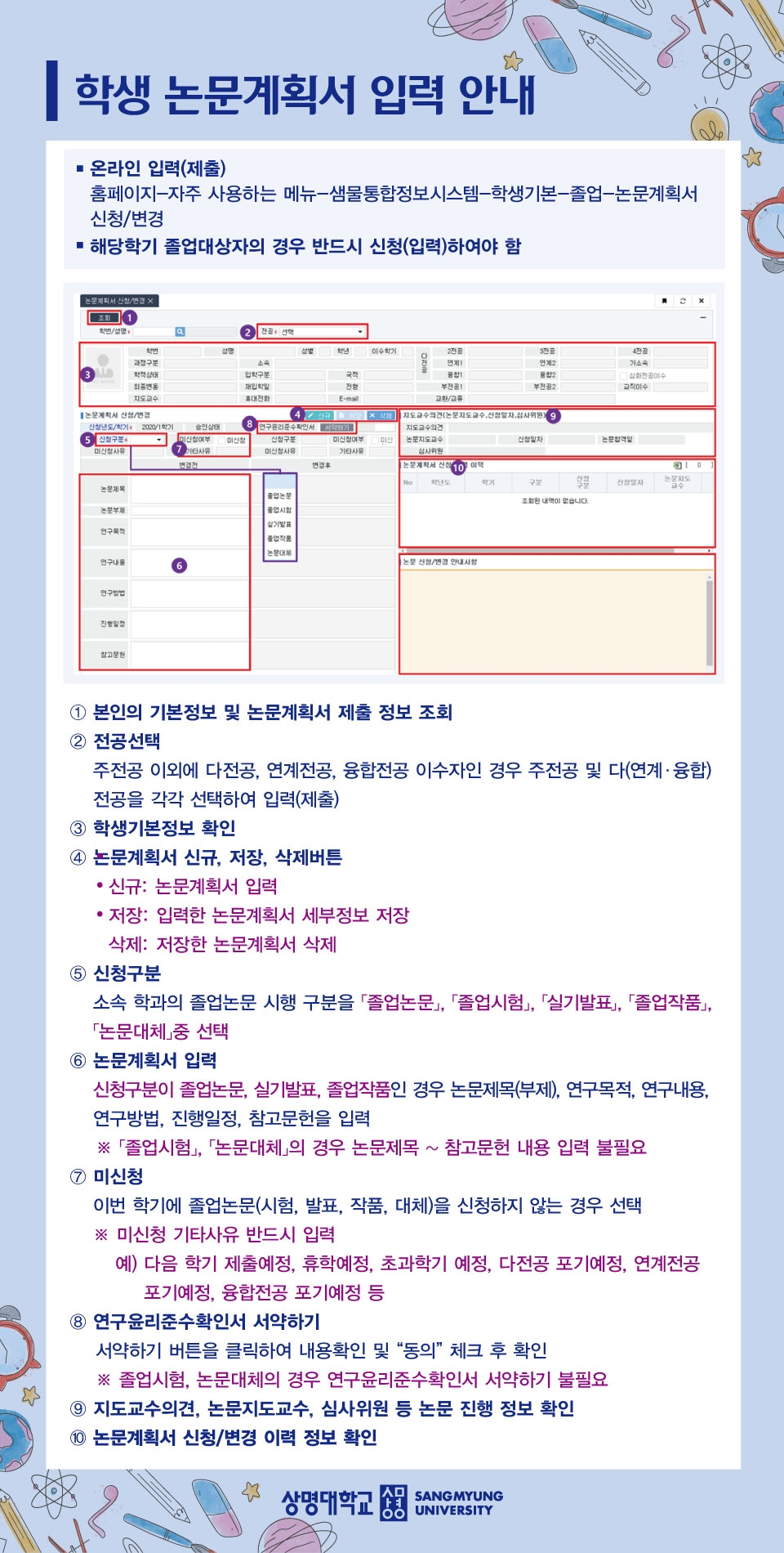 다. 졸업대상자 중 다음과 같은 사유("다음 학기 제출예정, 휴학예정, 초과학기 예정, 다전공 포기예정, 연계전공 포기예정, 융합전공 포기예정 등")로 졸업논문계획서를 미신청 할 경우에도 반드시 미신청 처리(입력)를 해주시기 바랍니다.