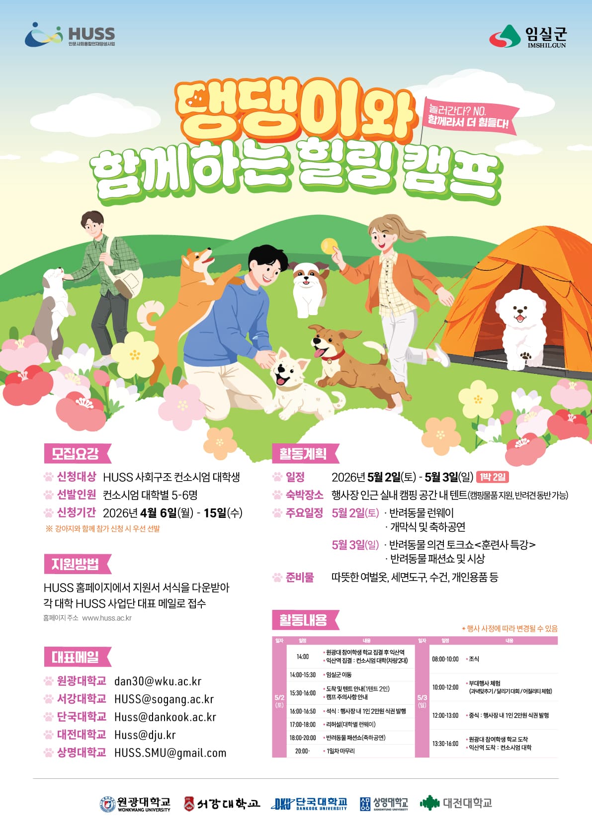 인문사회 융합인재양성사업(HUSS) 사회구조 컨소시엄에서는 HUSS 비교과 프로그램 ‘댕댕이와 함께하는 힐링 캠프’를 아래와 같이 개최합니다.